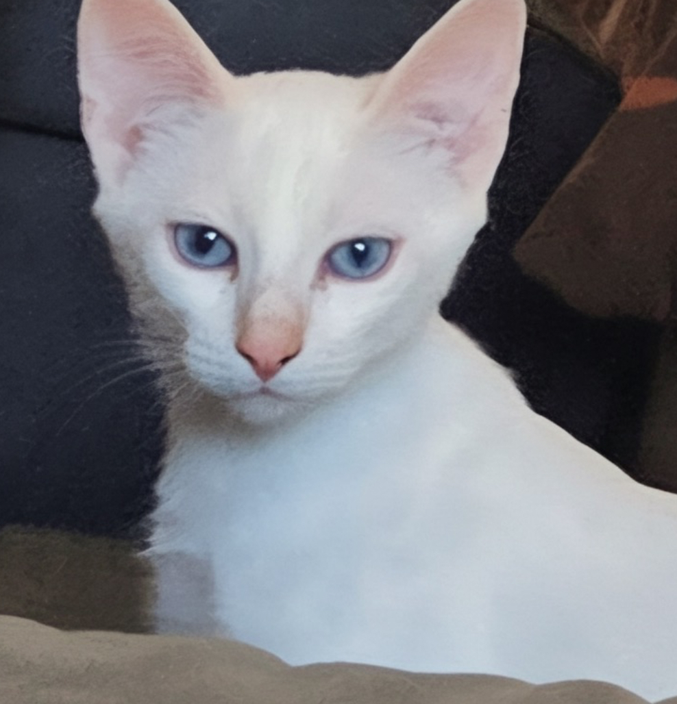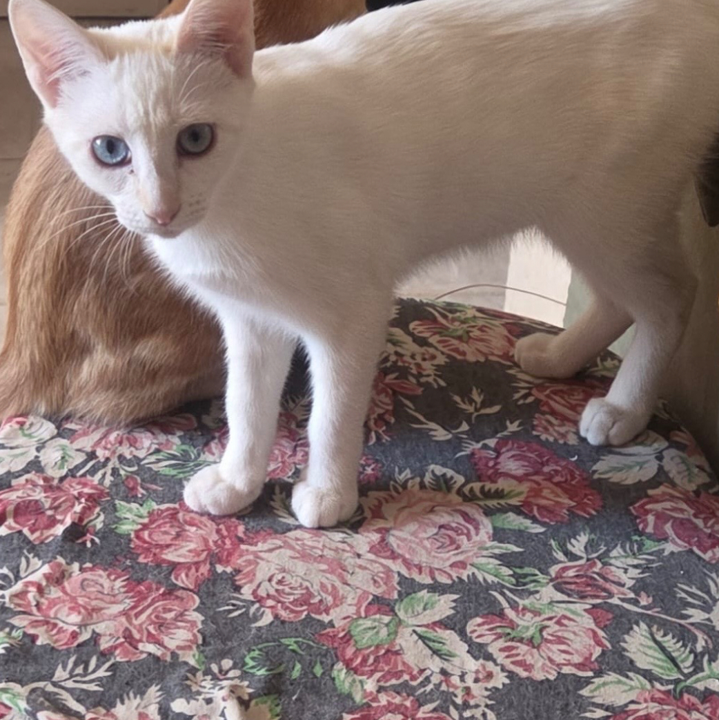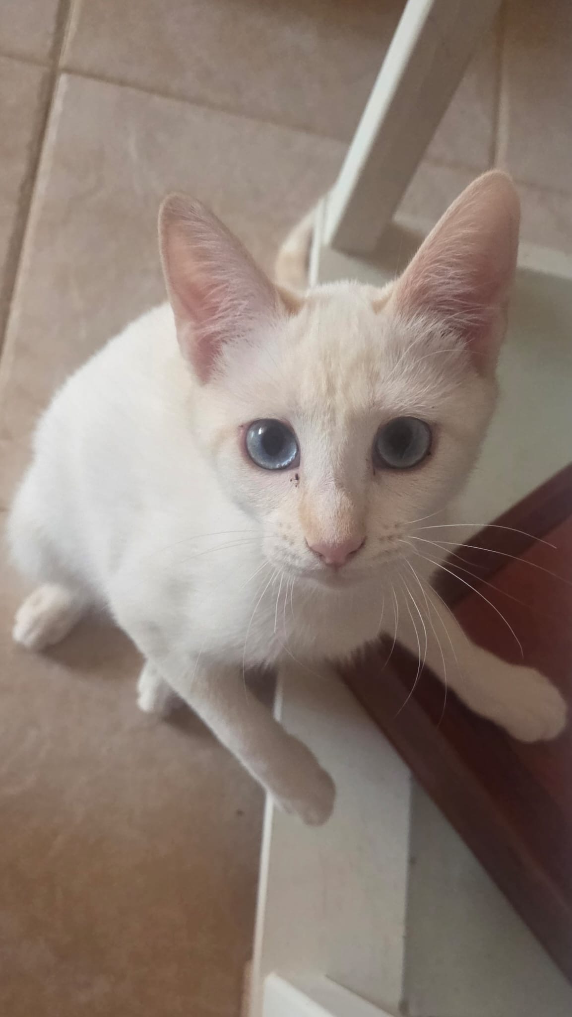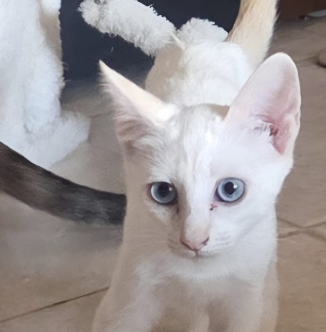 Este hermoso cachorro busca un hogar lleno de cariño. Tiene un pelaje completamente blanco y unos ojos azules que enamoran a cualquiera. Es curioso, juguetón y muy cariñoso: le encanta explorar, observar todo a su alrededor y disfrutar de la compañía. A pesar de su apariencia elegante, es un pequeño lleno de energía y ternura, ideal para una familia que quiera compartir momentos alegres y darle mucho amor. Si estás buscando un compañero dulce, activo y con una mirada que derrite corazones, ¡este gatito te está esperando! 🩵🐱