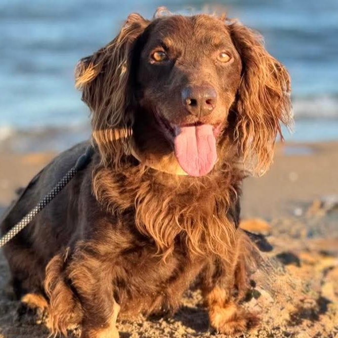 Este simpático perrito, teckel de pelo largo, se llama Cosmo y tiene ocho años. No demuestra mucha actividad, pero le encanta pasear y no tira de la correa. Además, cuenta con un tamaño pequeño / mediano ya que solamente pesa 11 kg. También se lleva especialmente bien con otros perretes, cuenta con un carácter fabuloso.