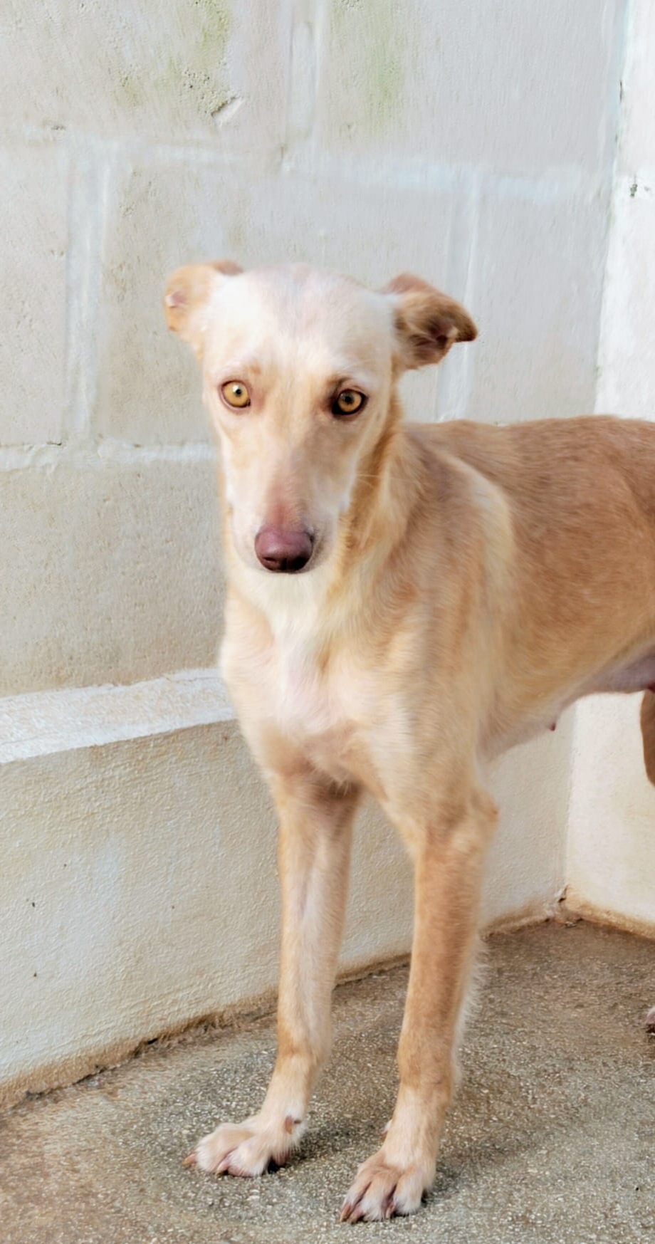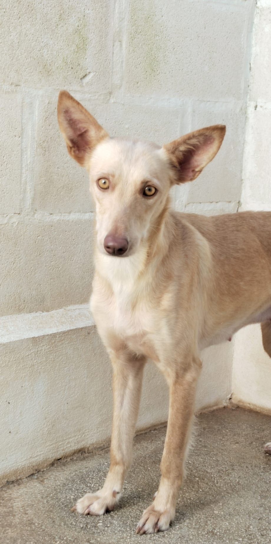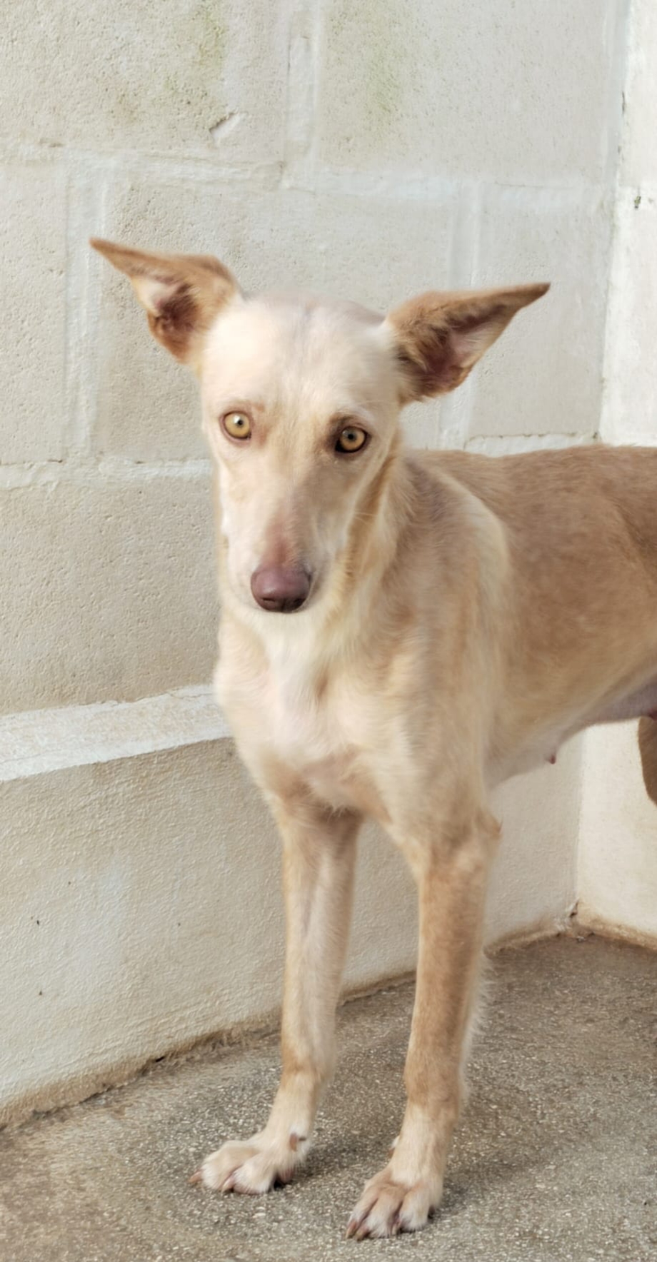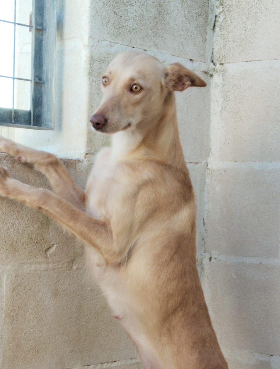 *KANA* Sexo: hembra Raza: podenco Fecha de Nacimiento: 01.02.2025 Peso: 11 kg Carácter: tímida y algo asustada todavía, pero es muy buena y sociable.