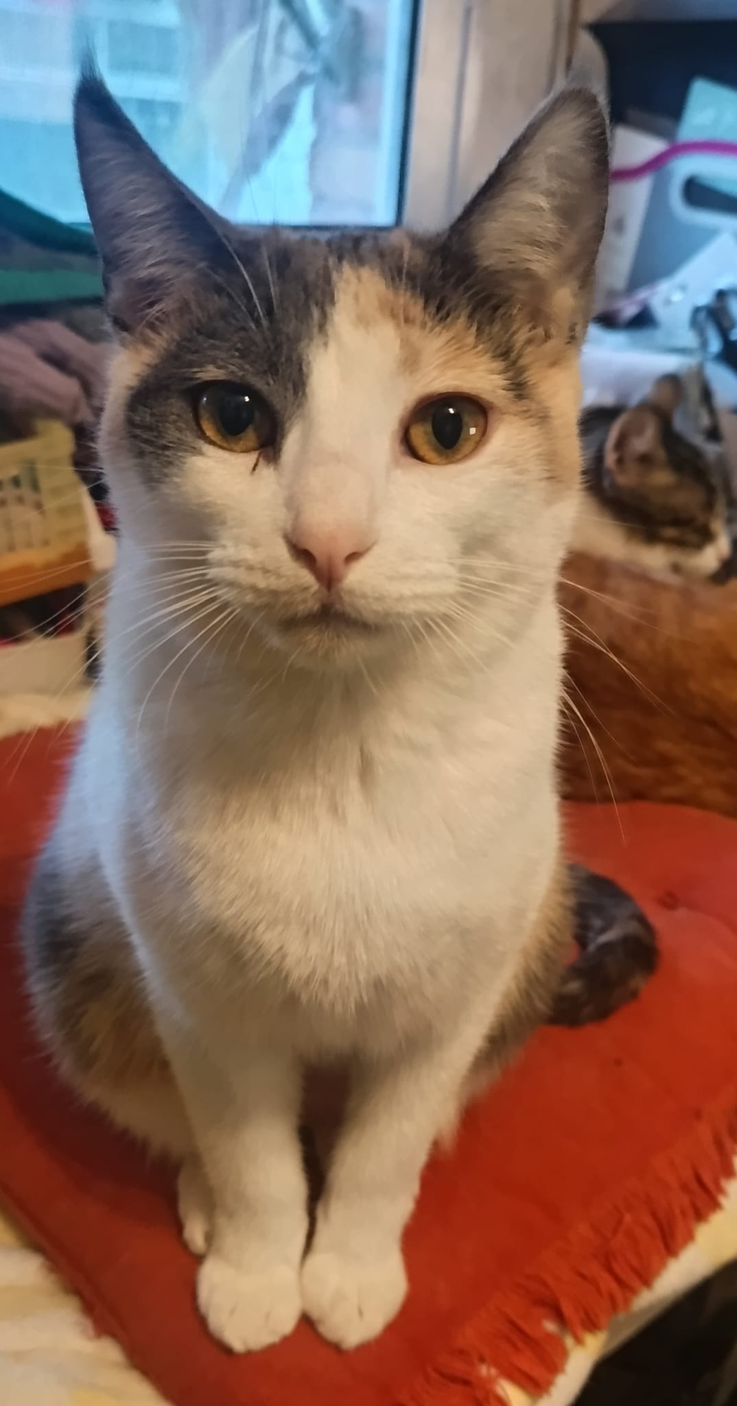 Sociable y juguetona. Le encanta estar con otros gatos