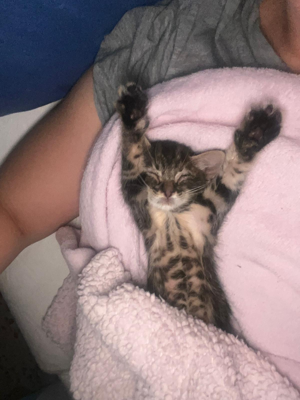 Parece que fue la única de la última camada de una gata de colonia que aún no se ha podido capturar para castrar. La cogimos porque tenía los ojos muy mal y de hecho es bastante probable que haya perdido la vista definitivamente. Aún no lo han confirmado en el veterinario porque está en tratamiento, pero no es fácil que recupere algo. Es muy cariñosa y juguetona, le encanta jugar con la cola del perro de la casa de acogida y se mueve con soltura sin importarle la falta de visión