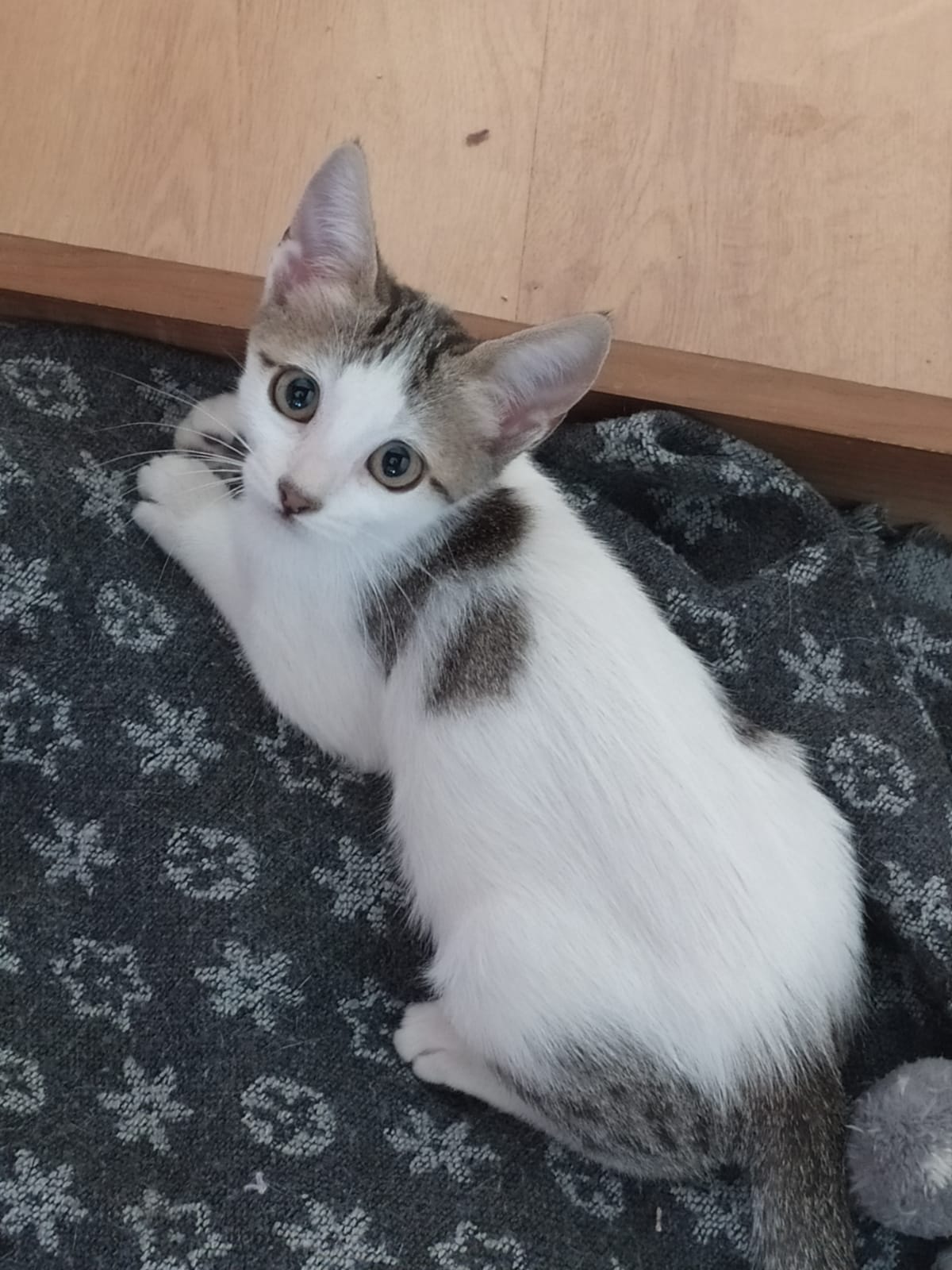 Fue abandonada en una cueva junto a sus hermanos y otra camada y el resto de adultos que vivían con la persona que los dejó a su suerte. Es una gatita muy cariñosa y sociable, muy apegada a su familia humana de acogida