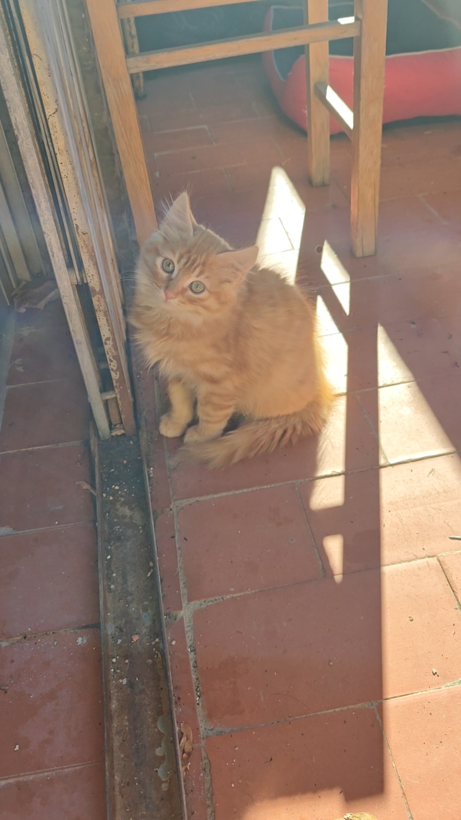 Su madre es una gata muy huidiza de los humanos que suele comer en casa de mi madre. Los tuvo en el sótano, porque no bajan nadie casi nunca, buscando un sitio resguardado y cuando tuvieron 2 meses, dado a lo huidizo de su naturaleza, lo acogimos a él y a sus hermanos para socializarlos con personas. Solo queda él por encontrar casa de los 5 hermanos