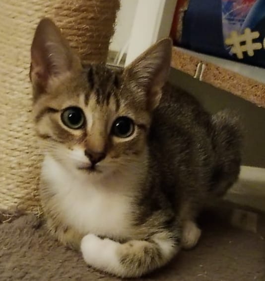Fue abandonado en una cueva junto a sus hermanos y otra camada y el resto de adultos que vivían con la persona que los dejó a su suerte. Es un gatito muy cariñoso, muy apegado a su familia humana de acogida y al que le encanta jugar con su hermana Ginny. Es muy divertido y muy glotón, ya ha conocido a los gatos adultos que viven en la casa y se está adaptando sin problema