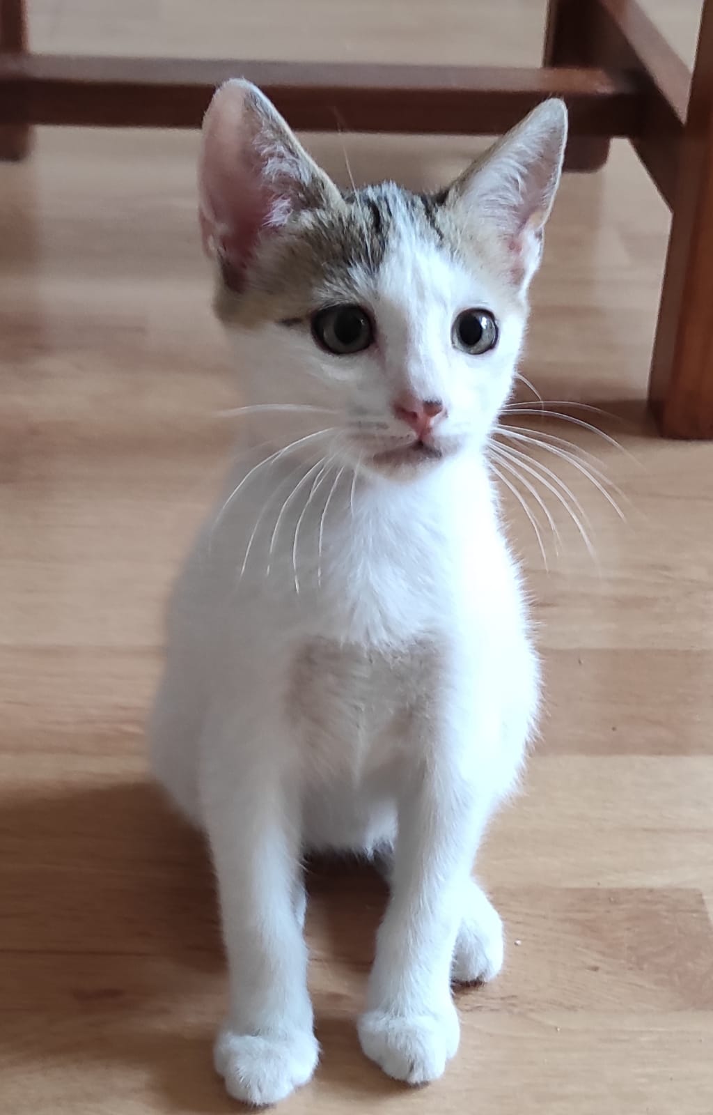 Fue abandonado en una cueva junto a sus hermanos y otra camada y el resto de adultos que vivían con la persona que los dejó a su suerte. Es un gatito cariñoso, aunque ha sido el último en confiar y dejarse mimar. Es muy glotón, en cuanto ve una chuchería se le olvida que alguna vez ha sido un gatito tímido