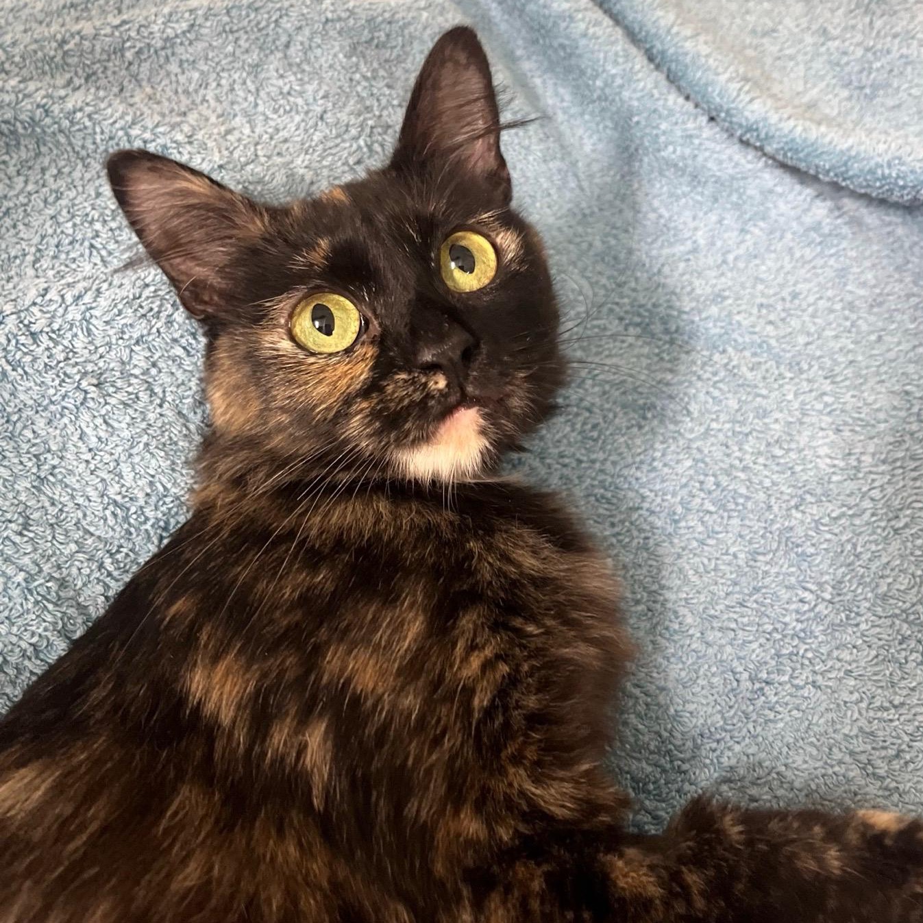 Kali es una gata carey de pelo semilargo de unos dos años aproximadamente y muy cariñosa, le encantan las caricias y se pone panza arriba para que le acaricies la barrigota.