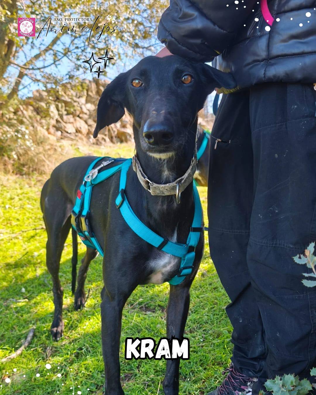 Kram es un galguito que por fin está aprendiendo que puede disfrutar de la vida. Pide mimos ¡y le encantan!