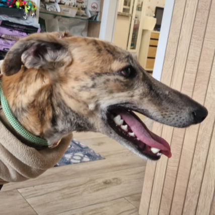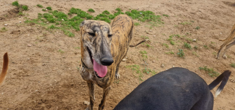 Kali es una galga juguetona, activa, simpática y con ganas de marcha, se lo pasa pipa jugando con el resto del grupo de galgos. Era compañera inseparable de Esme, ya adoptada, por lo que ahora le toca a ella. Ideal para una persona que quiera disfrutar de una galga sin miedos correteando con esas patas locas de acá para allá.