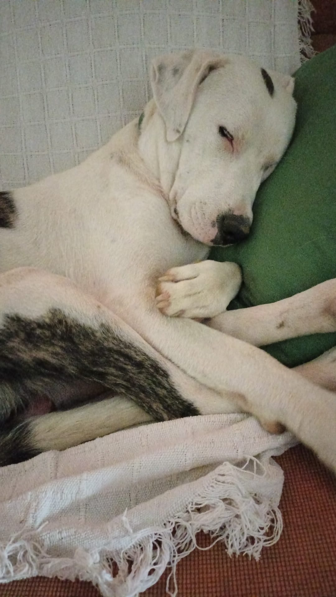 Nos dieron aviso de que se había refugiado en la entrada de una fábrica un perro, buscaba agua y un lugar para dormir. Lo rescatamos y actualmente se encuentra en acogida con una compañera del refugio. Convive con una mastina, un bodeguero y varios gatos. Sin problema con ninguno.