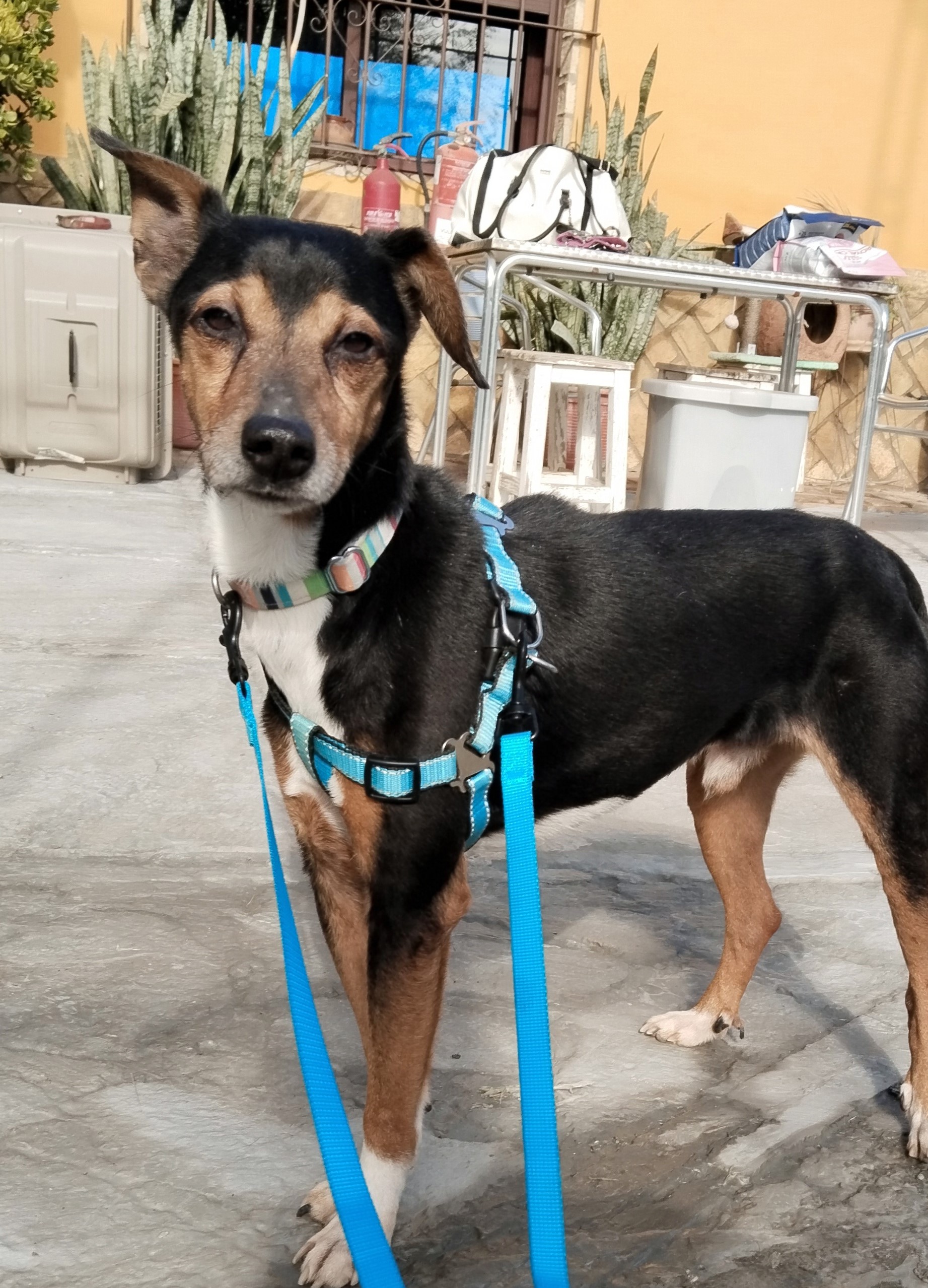 Sonic es un perro con mucho miedo, muy noble y buenisimo con personas y otros animales, pero debido al maltrato sufrido, siente miedo mucho miedo. Necesita una familia paciente y muy cariñosa, con mucho cuidado. Cuando conoce a las personas se apega mucho y se refugia en ellas.