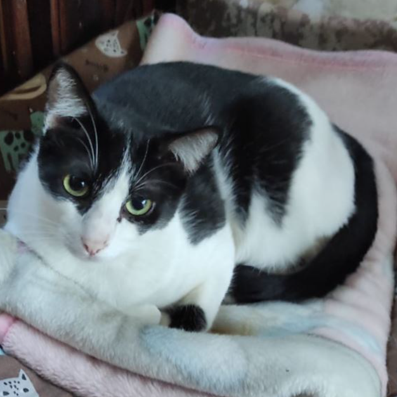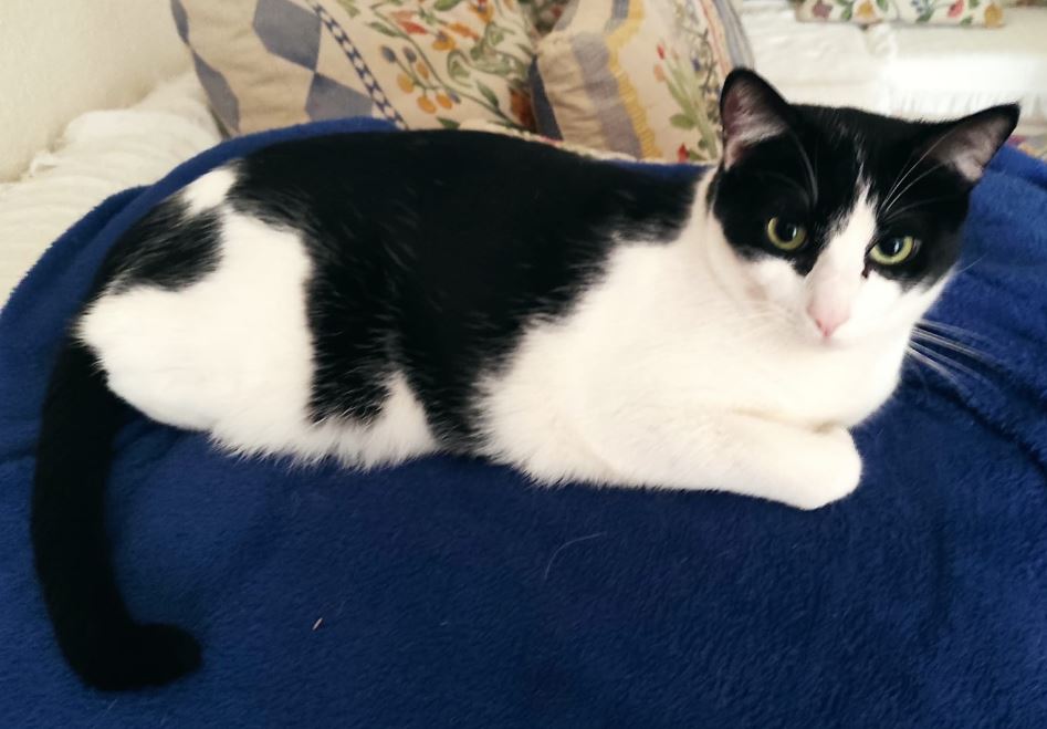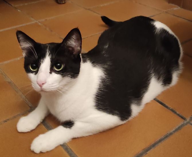 Estaba junto a sus dos hermanos (ya adoptados) en un edificio antiguo, su mamá falleció y se encontraban solos, en aquel momento tenía 2 meses y siempre ha sido un gatete muy miedoso.