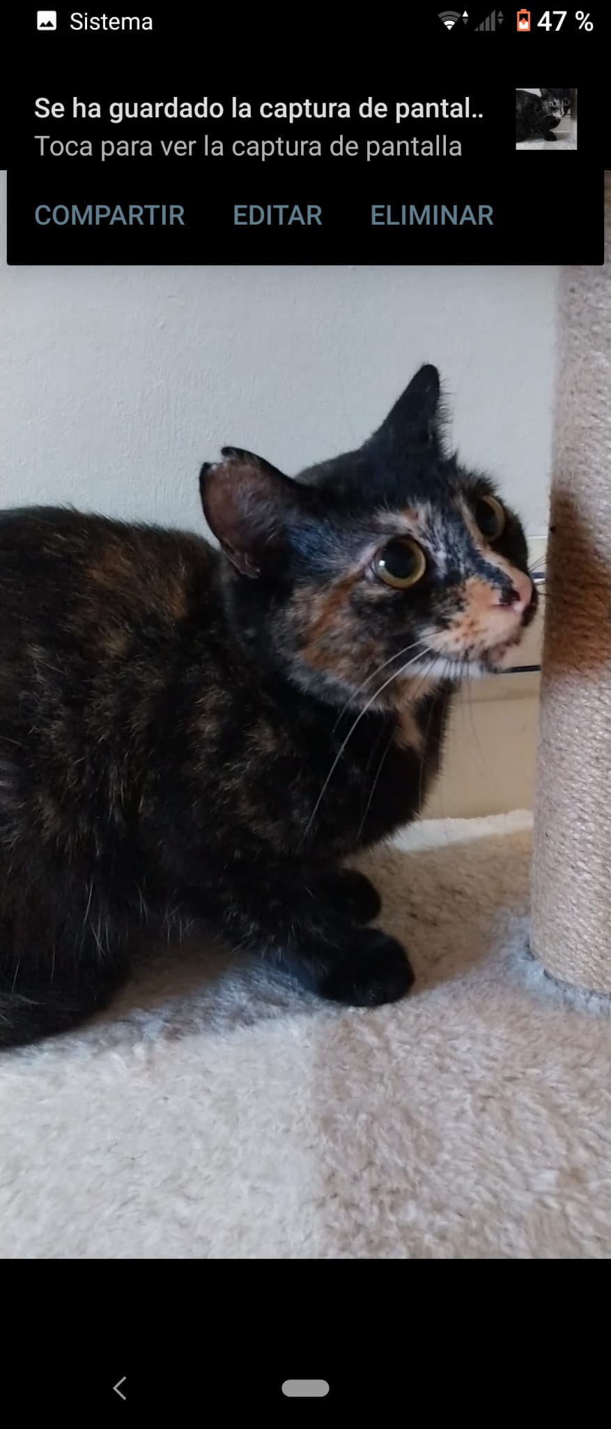 Gatita carey de siete meses en adopción en Museros, a diez minutos de Valencia capital. Está ya vacunada, esterilizada y testada negativa. Es muy buena y tranquila, algo tímida pero muy noble. Buscamos hogar definitivo que le dé mucho amor 😍. Contacto 654760736.