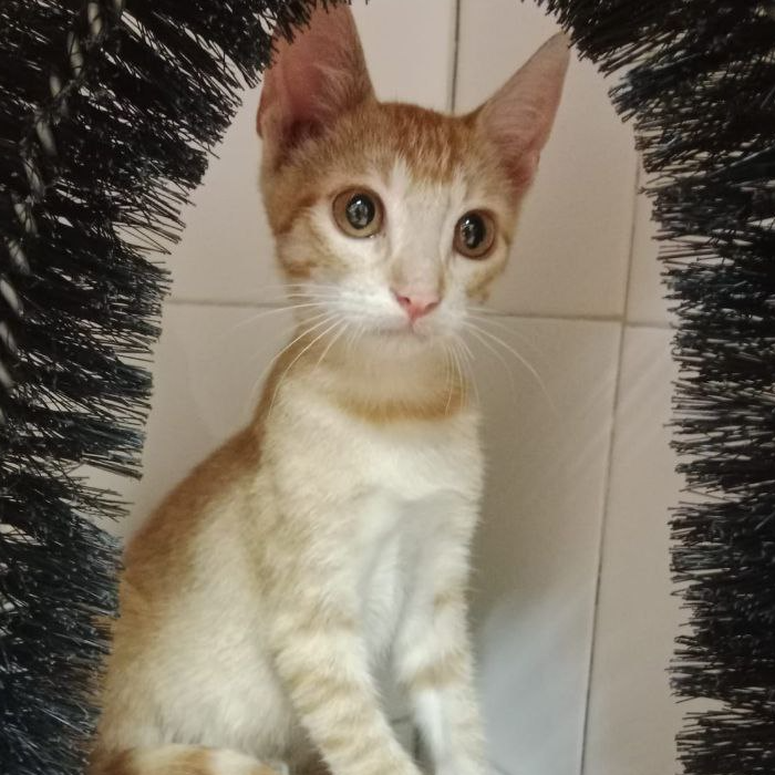 este pequeñete de ojos color almendra es Dorito, nos avisaron de que habia un gatete en medio de un cruce de carreteras y corriendo gran peligro de atropello, al llegar se dejo coger sin problemas y resulto ser un saquito de mimos...tendra alrededor de 2 meses, esta desparasitado y esperando darte muchos mimos.