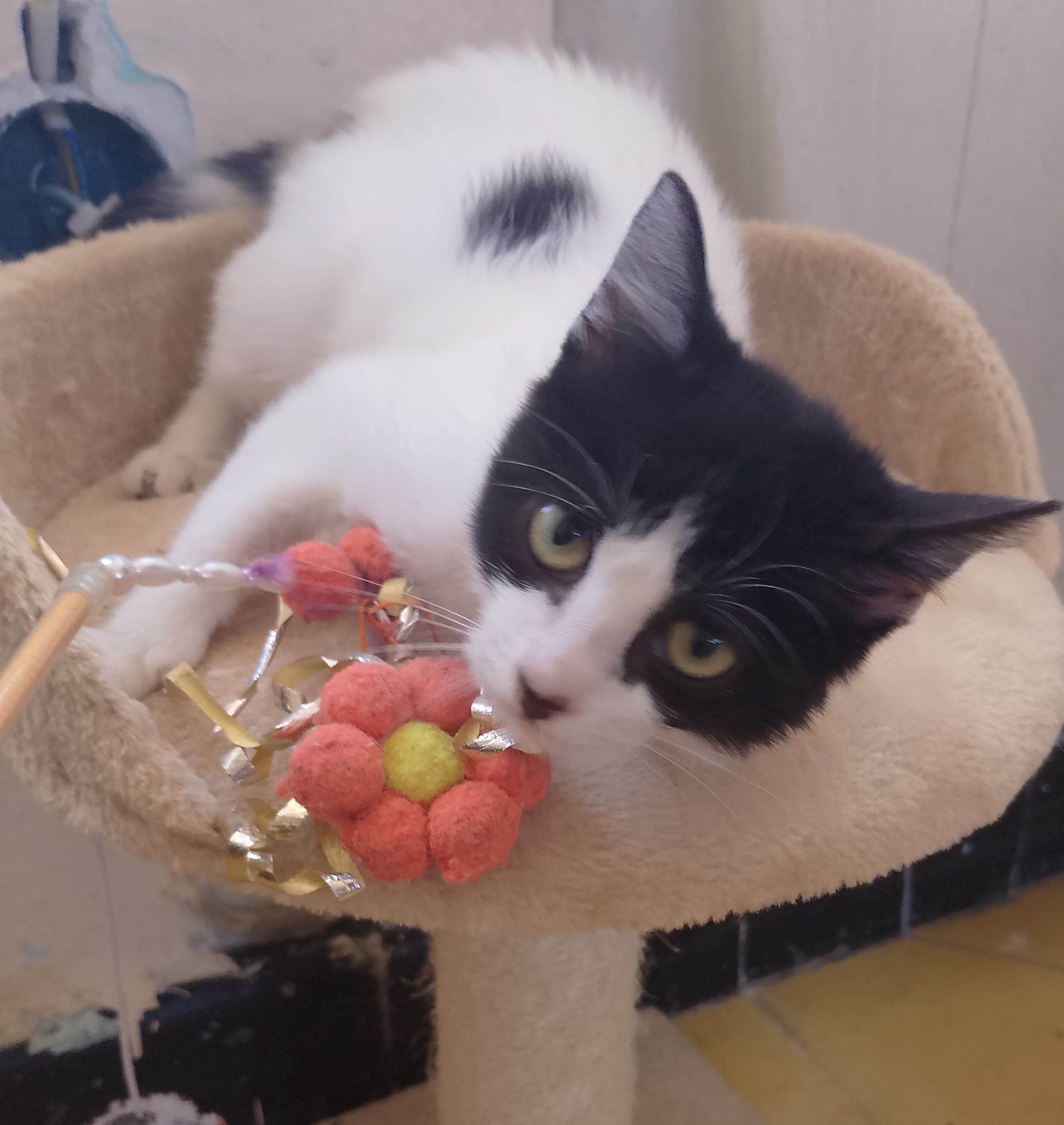 Apareció muy asustada buscando comida. Los gatos adultos de la colonia la querían echar y le marcaban y bufaban. La pudimos recoger en la sede y está a la espera de adopción. Es un poco miedosa al principio, pero si le das su tiempo te abres su corazoncito y se vuelve una gatita buena y sociable. Le encanta JUGAR