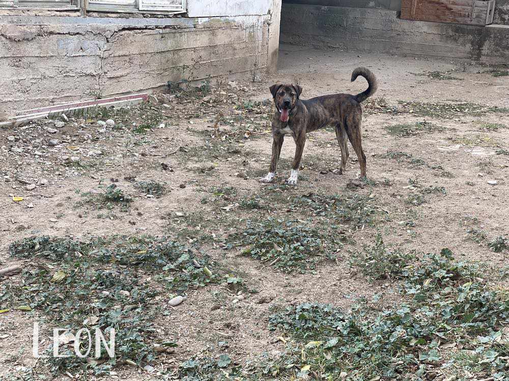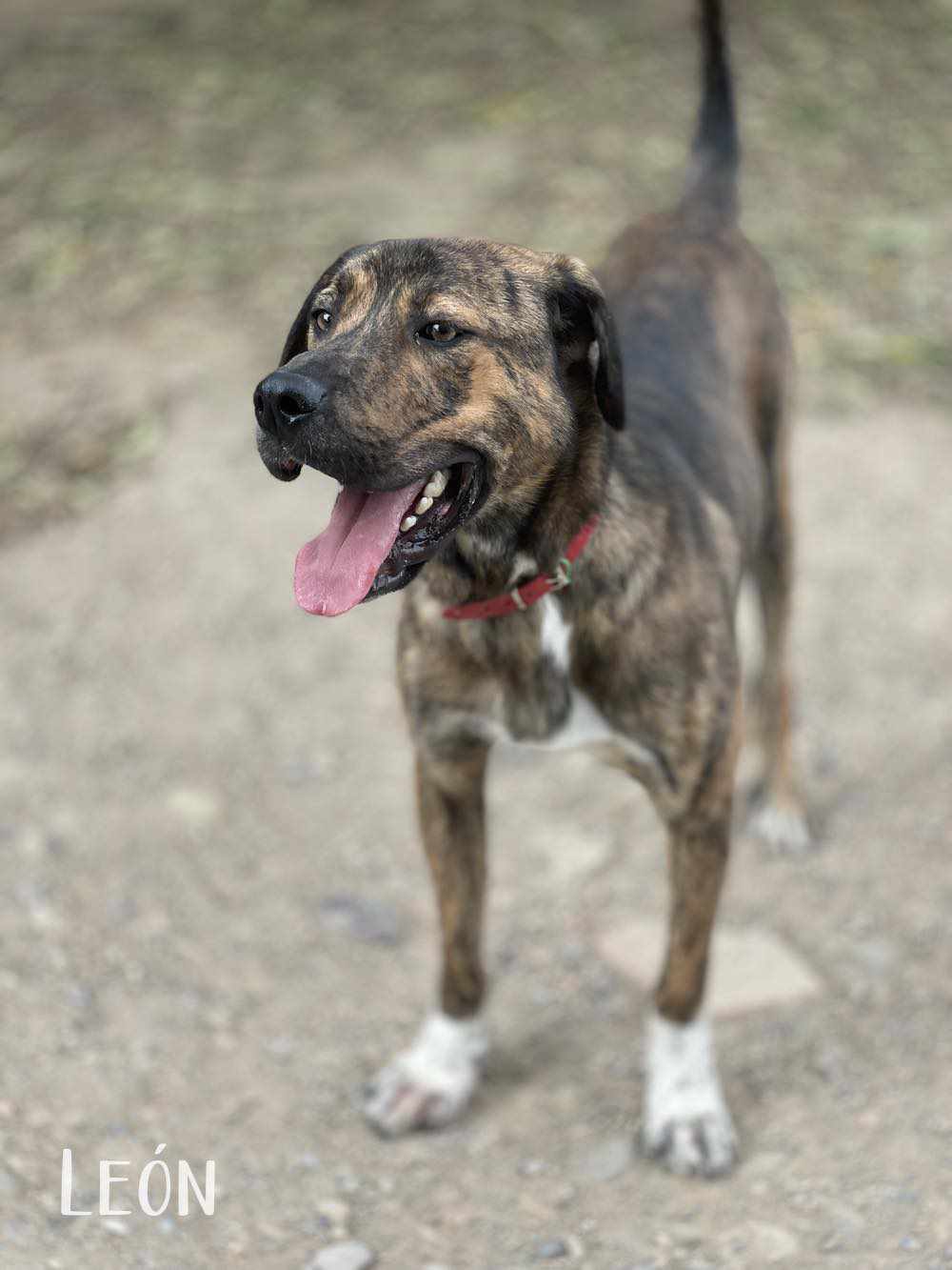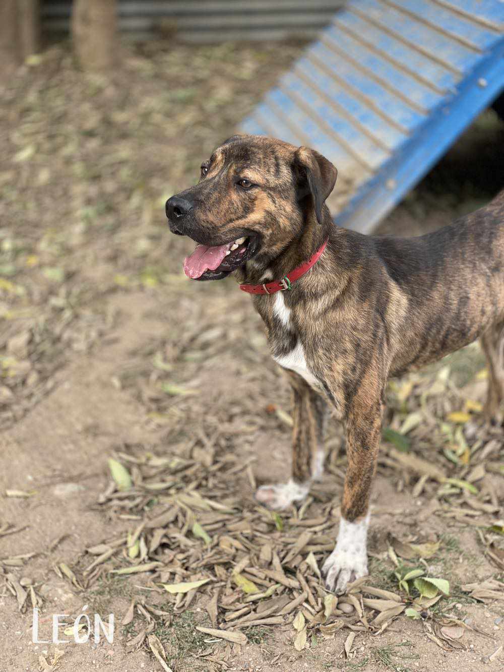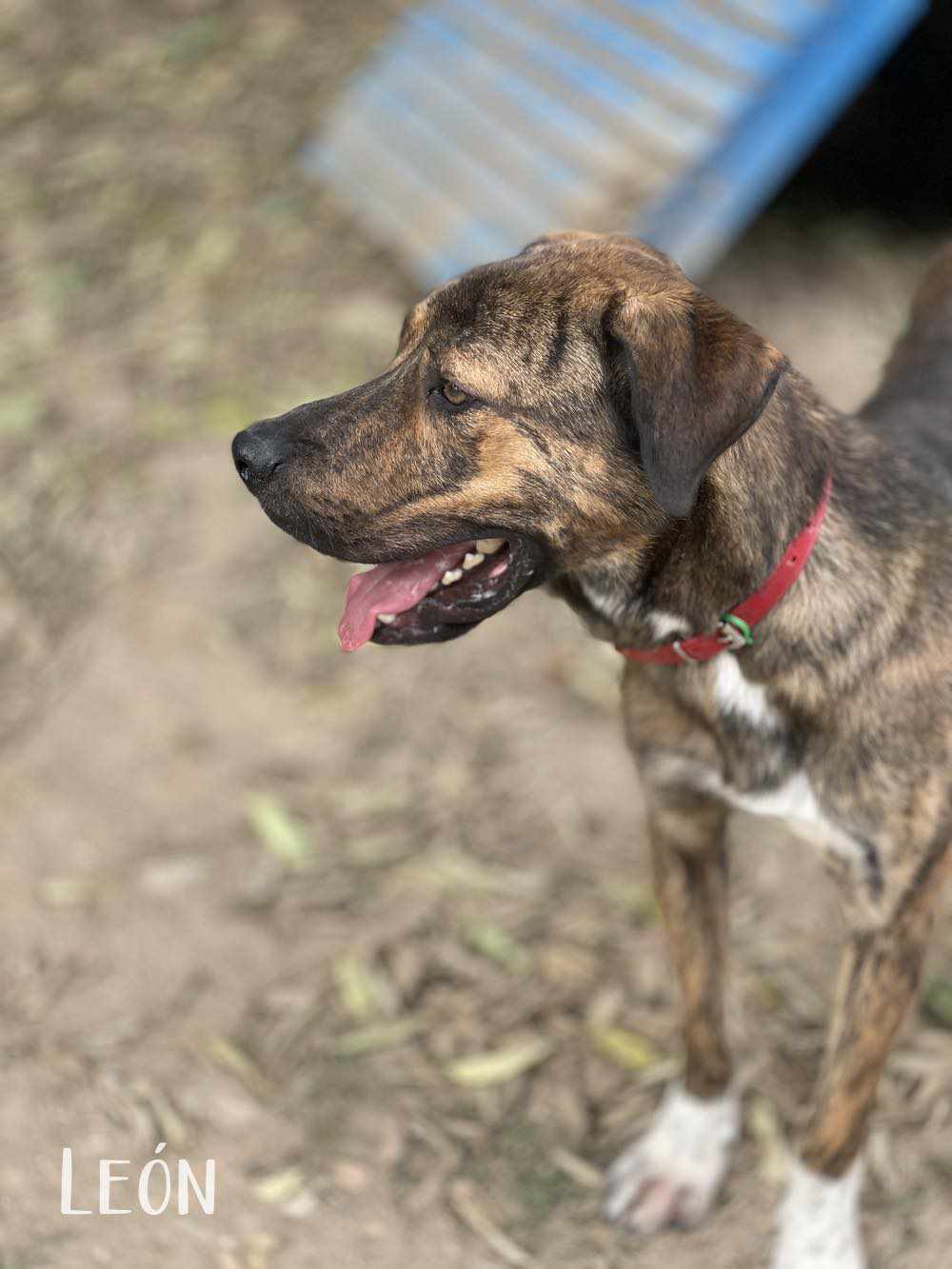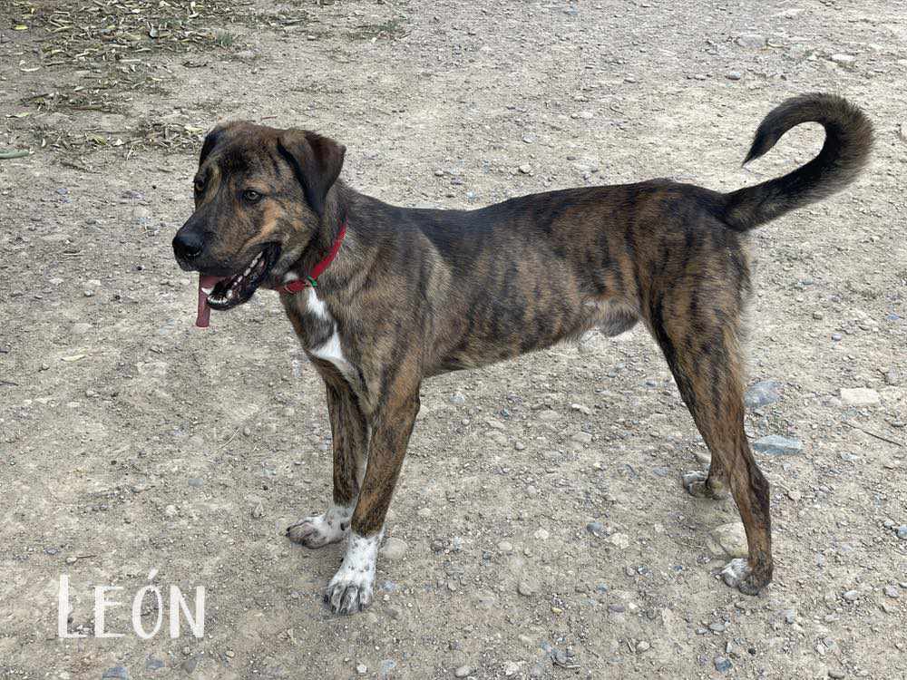 LEÓN, está en adopción en Tarazona (Zaragoza). Esta belleza de mestizo de mastín, es un espectáculo en su fuerza y vitalidad. Es muy sociable y mimoso con todo el mundo que ya conoce. Es muy juguetón y algo brutote. Con los desconocidos, si está en el patio, se muestra vigilante y muy protector del territorio, (como medio mastín que es). Con hembras sale al patio y se lleva bien con ellas. Con machos no tanto. Vivir con una familia que tenga jardín sería lo ideal.
