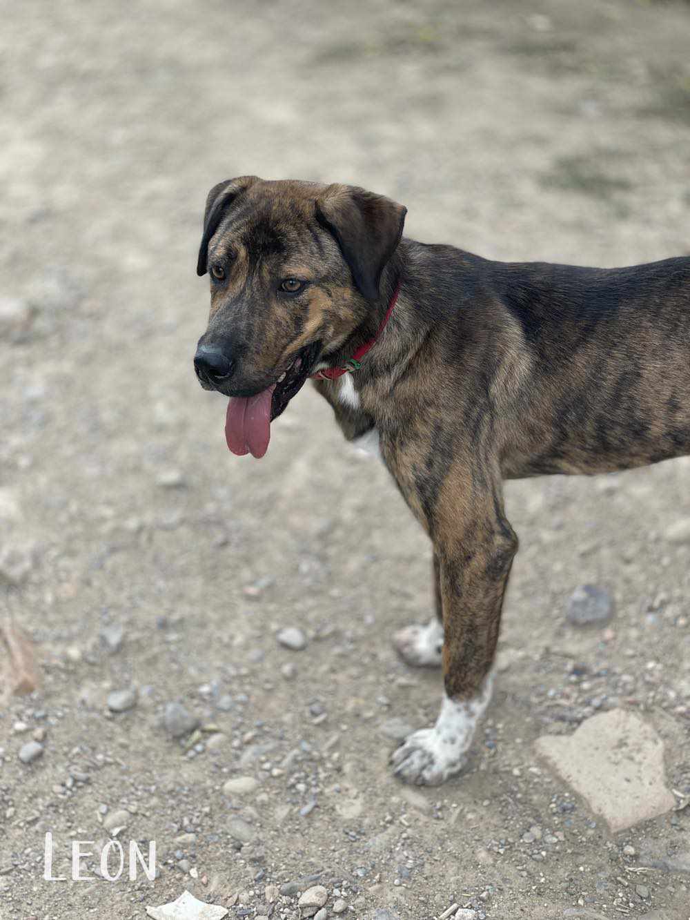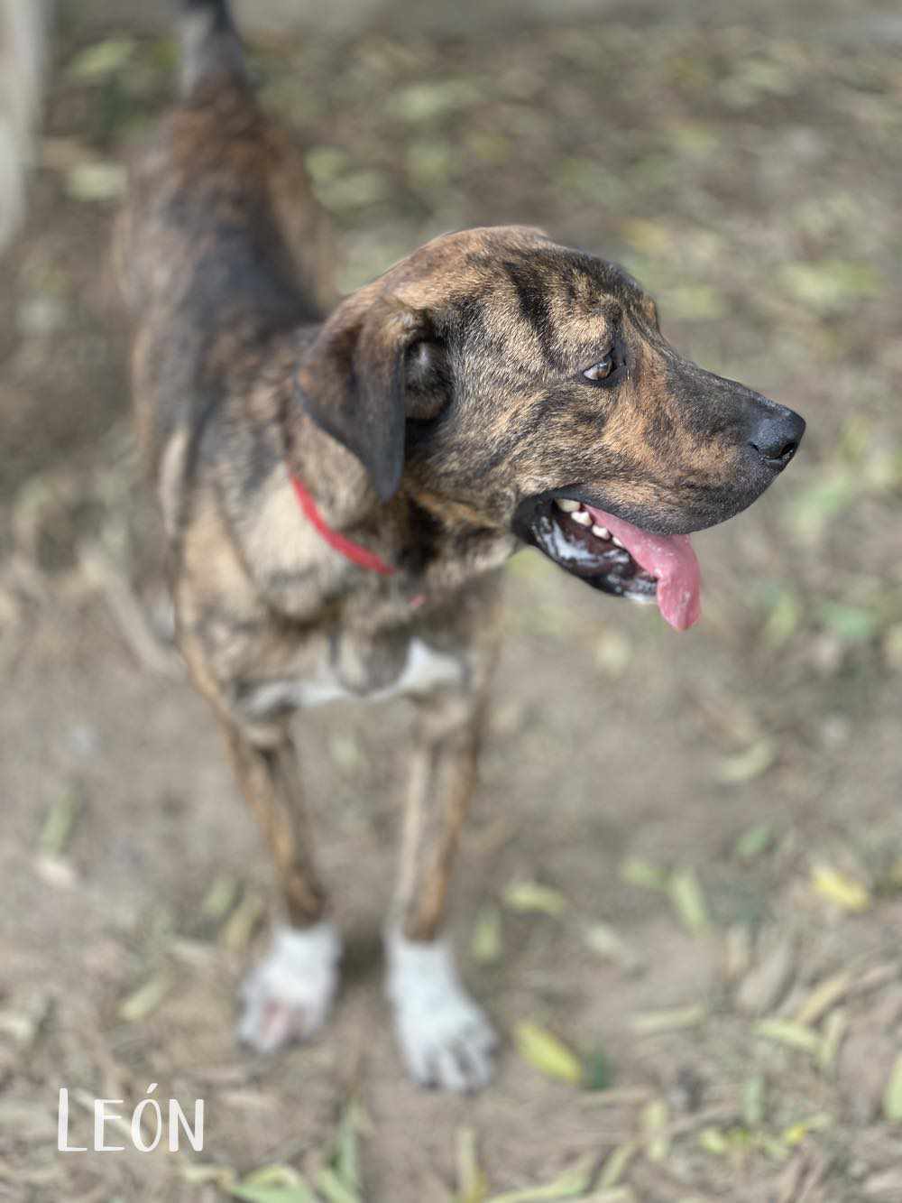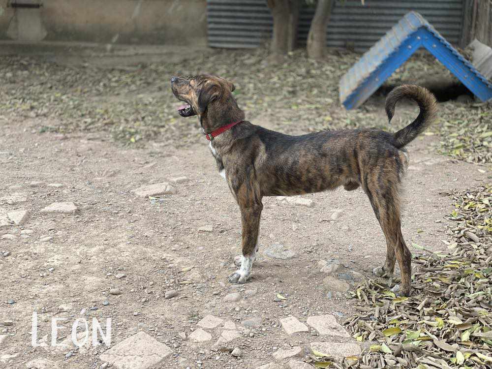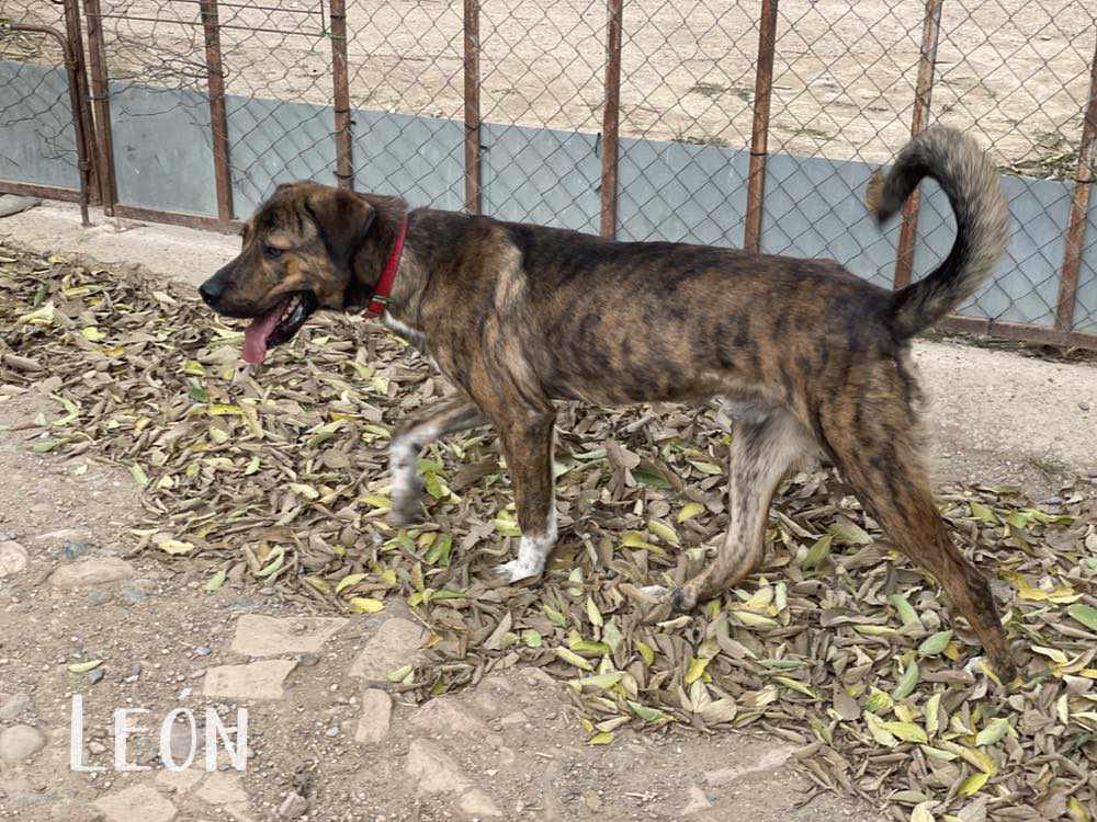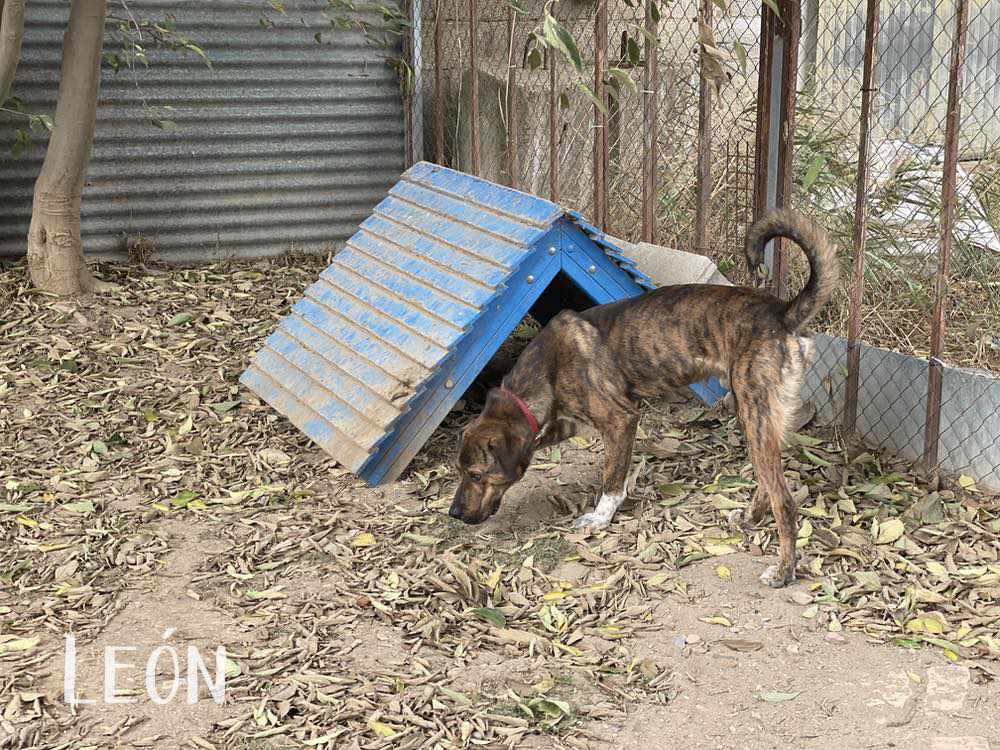 LEÓN, está en adopción en Tarazona (Zaragoza). Esta belleza de mestizo de mastín, es un espectáculo en su fuerza y vitalidad. Es muy sociable y mimoso con todo el mundo que ya conoce. Es muy juguetón y algo brutote. Con los desconocidos, si está en el patio, se muestra vigilante y muy protector del territorio, (como medio mastín que es). Con hembras sale al patio y se lleva bien con ellas. Con machos no tanto. Vivir con una familia que tenga jardín sería lo ideal.